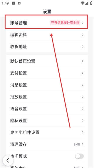 3、进入设置界面后,点击【账号管理】选项,就能跳转到账号管理页面,处理账号相关的各项设置啦。