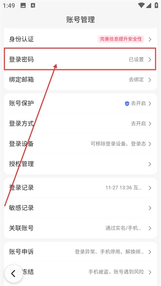 4、进入账号管理页面后,点击【登录密码】选项,就能进入密码管理界面,对密码进行修改或重置操作了。
