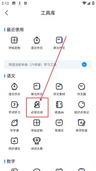 2、在工具库的语文分类中,找到【必背古诗】选项并点击,即可进入古诗背诵的学习模块。