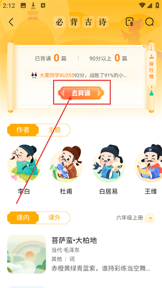 3、进入必背古诗页面后,点击【去背诵】按钮,即可启动古诗的背诵学习流程。