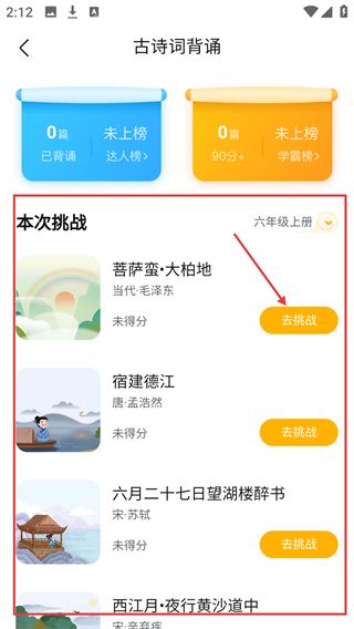 4、在古诗词背诵页面,挑选你想要挑战的篇目,点击对应的【去挑战】按钮,即可开启该首古诗的背诵任务。