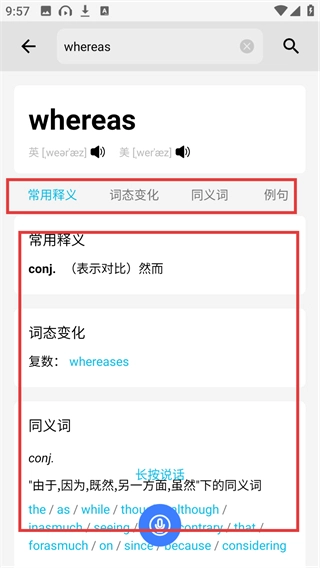 3、搜索单词(例如【whereas】)后,系统会呈现该单词的常用释义、词形变化、同义词等详细信息,便于用户理解词义。