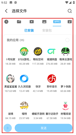 2、进入选择文件页后,在【已安装】列表里选要分享的应用,选好后点【发送】就能分享啦。