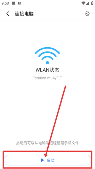 4、在连接电脑页点【启动】按钮,就能开启WLAN连接,之后可从电脑端管理手机文件啦。