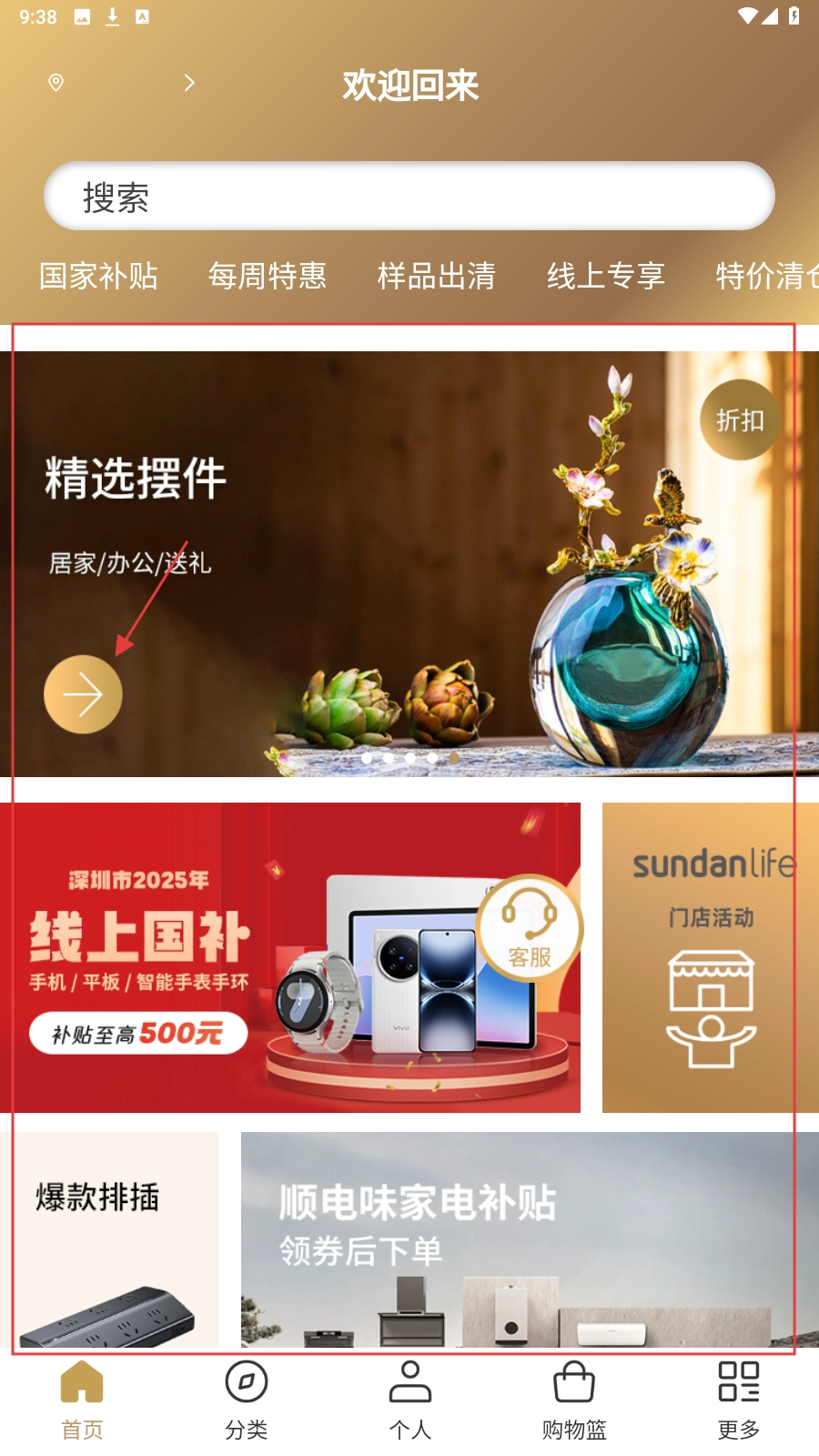 1、在首页点击【精选摆件】区域箭头,进入摆件分类页面选品。