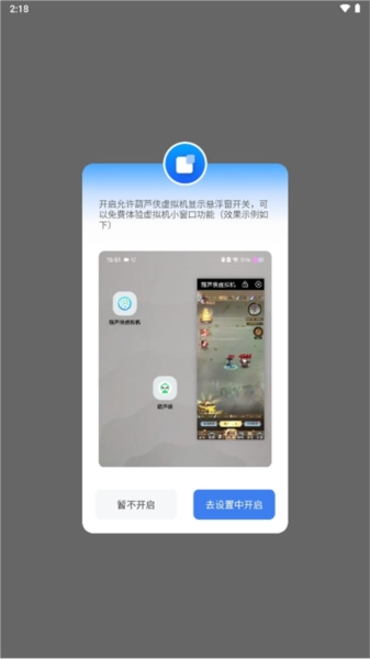 :系统资源的智能分配,可以轻松的达到两个目的的效果,高度兼容的系统完美运行应用程序游戏。1、进入本站后打开软件首页,会弹出一个弹窗,点击“去设置”开启相关功能;