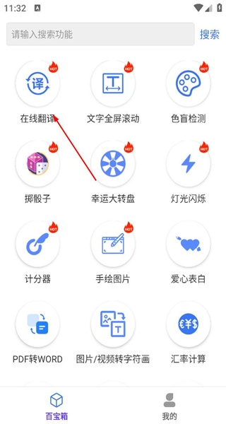 1、启动软件后,进入百宝箱界面,这里会呈现在线翻译、色盲检测等功能选项,点击在线翻译选项,即可进入翻译操作页面。