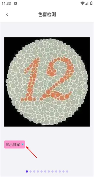 3、开启色盲检测功能后进入对应界面,会看到色盲检测图,点击“显示答案”按钮即可查看检测结果。