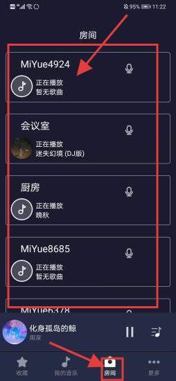 3、在【房间界面】,点击【MiYue4924】等房间名进入,操作按钮控制房间内歌曲播放。