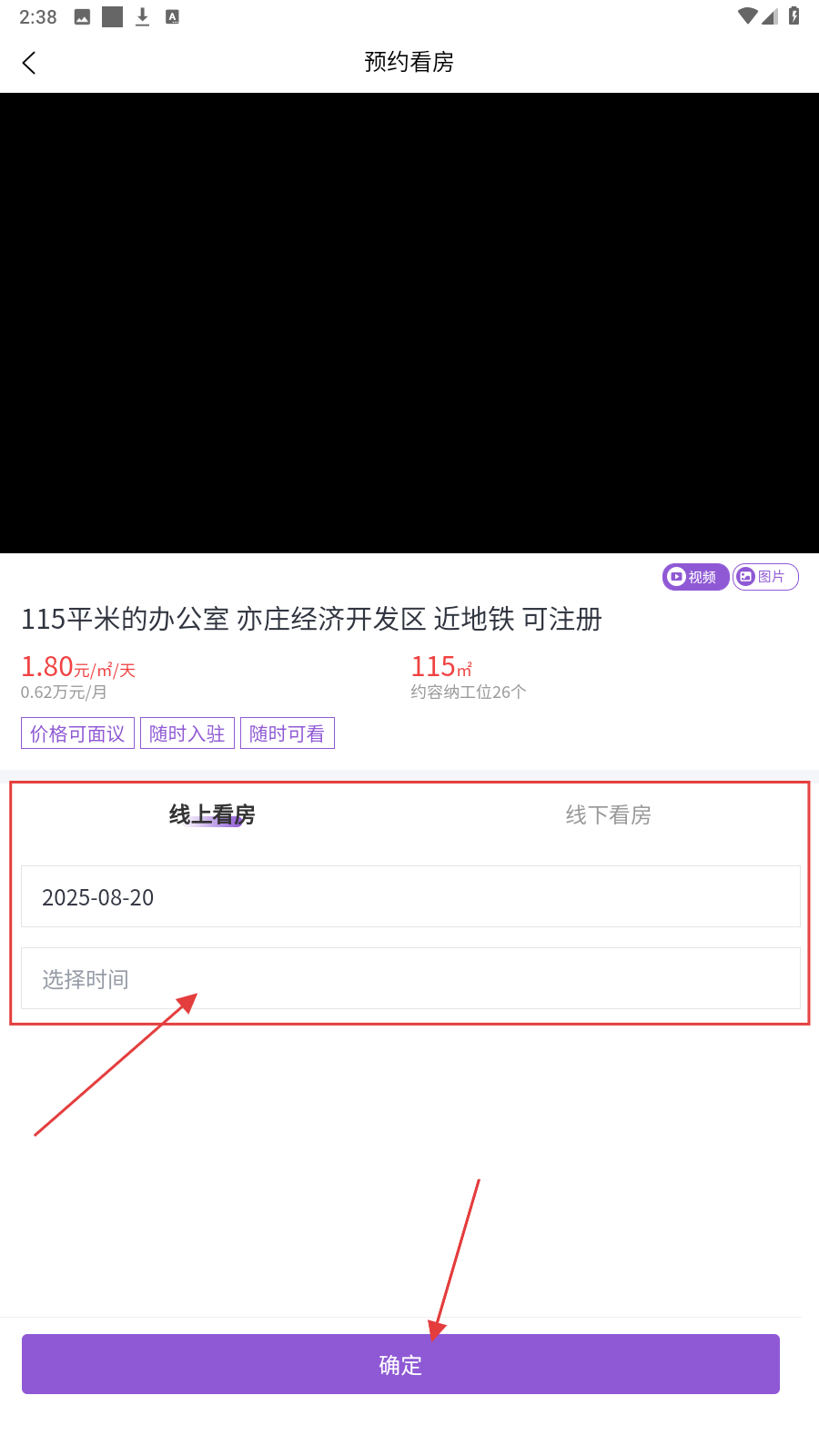 4、在预约看房页,选线上/线下看房及时间,点【确定】完成预约。