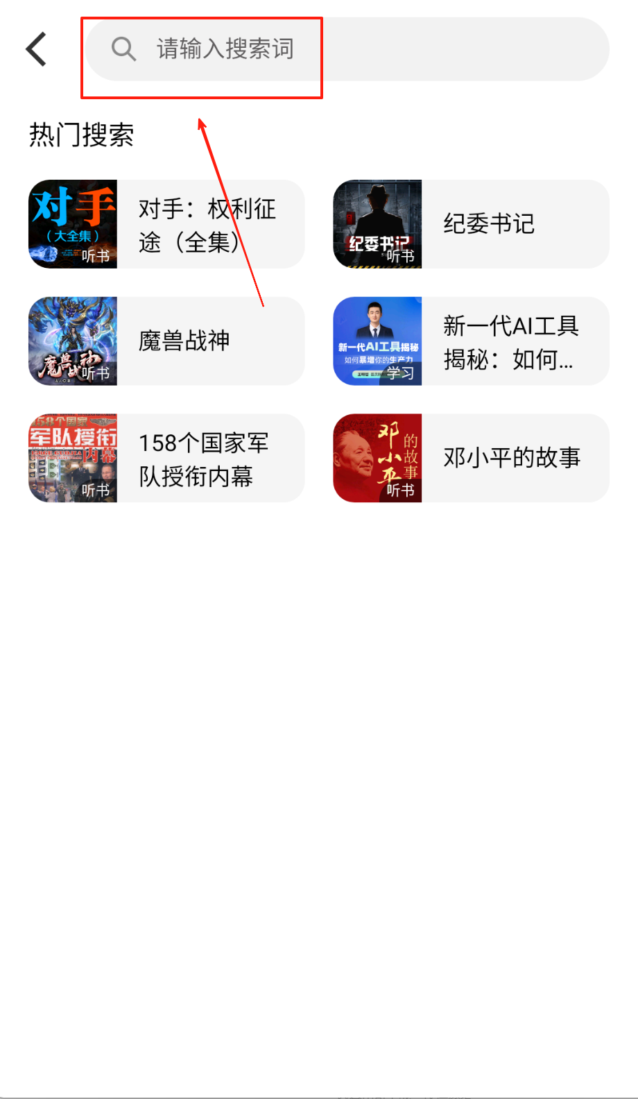 1、安装后打开应用浏览热门书籍或输入关键词搜索目标内容,选定作品直接播放收听。