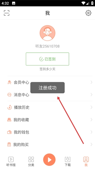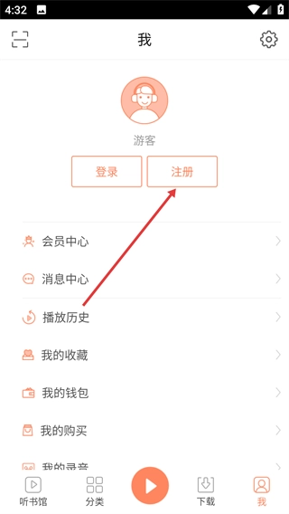 1、进入【我】的页面后,点击【注册】按钮,即可跳转至注册页面。