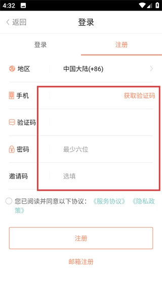 2、在注册页面填写【手机号码】【验证码】【密码】等相关信息,并勾选同意协议的选项。