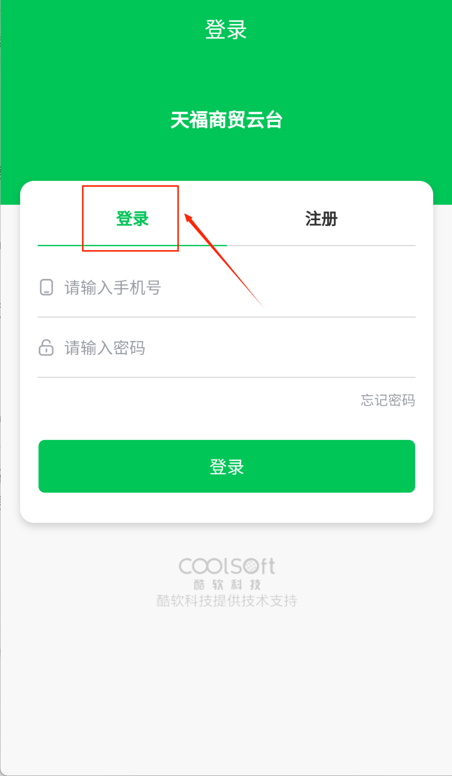 3、登录界面是绿色背景很醒目呢,中间有天福商贸云台的logo,输入手机号和密码就能登录,忘记密码的话右边就有入口很方便哦。