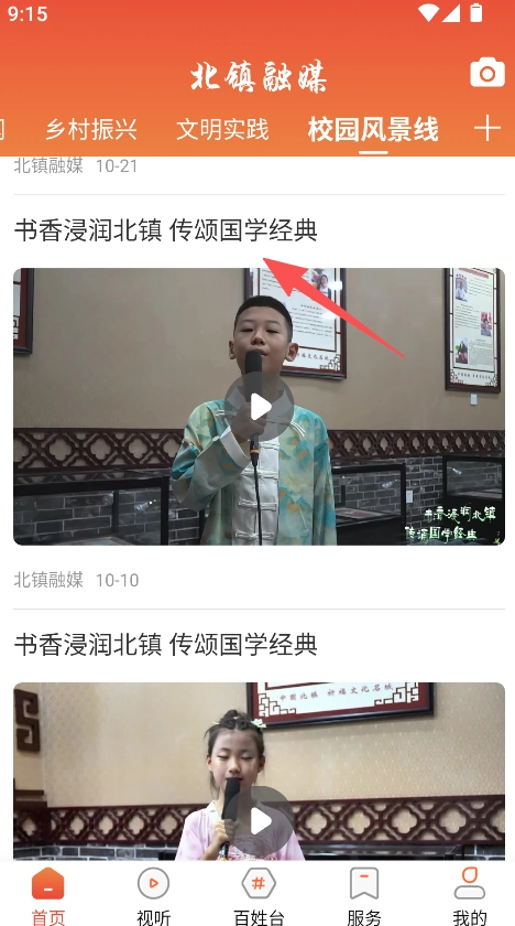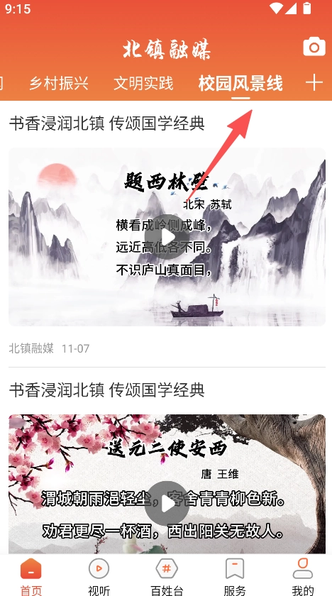 1、挑选分类板块(例如校园风景线),进入与之对应的内容区域。