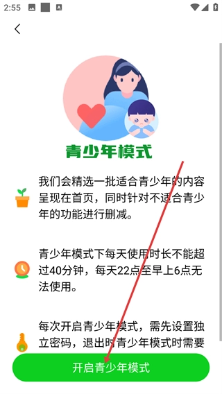 3、在青少年模式界面,点击【开启青少年模式】按钮,准备开启青少年模式。