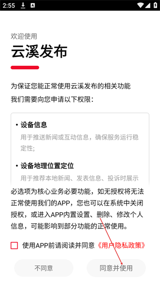 1、在应用启动后的权限申请弹窗中,勾选“使用前请阅读并同意《用户隐私政策》”,点击【同意并使用】按钮,进入应用首页。