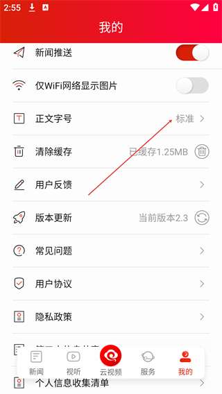3、在个人中心页面,选择【正文字号】选项,进入正文字号调整页面。