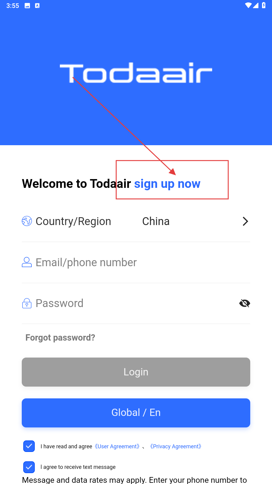 1、打开应用,在登录界面点击【signupnow】,进入注册页面。