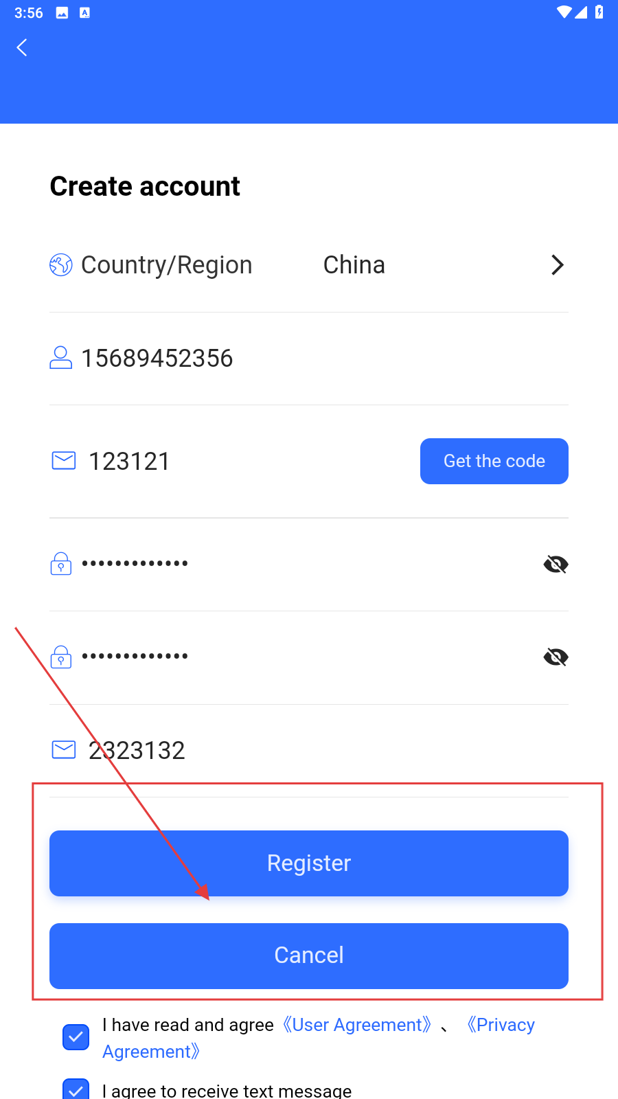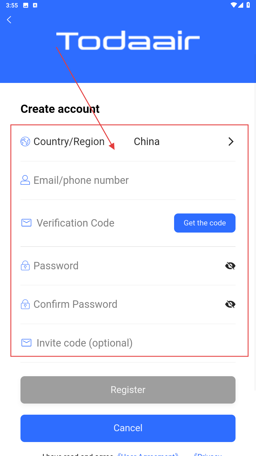 2、在注册页面,确认【Country/Region】为【China】,在输入邮箱或手机号,点击获取验证码并填入设置并确认密码。