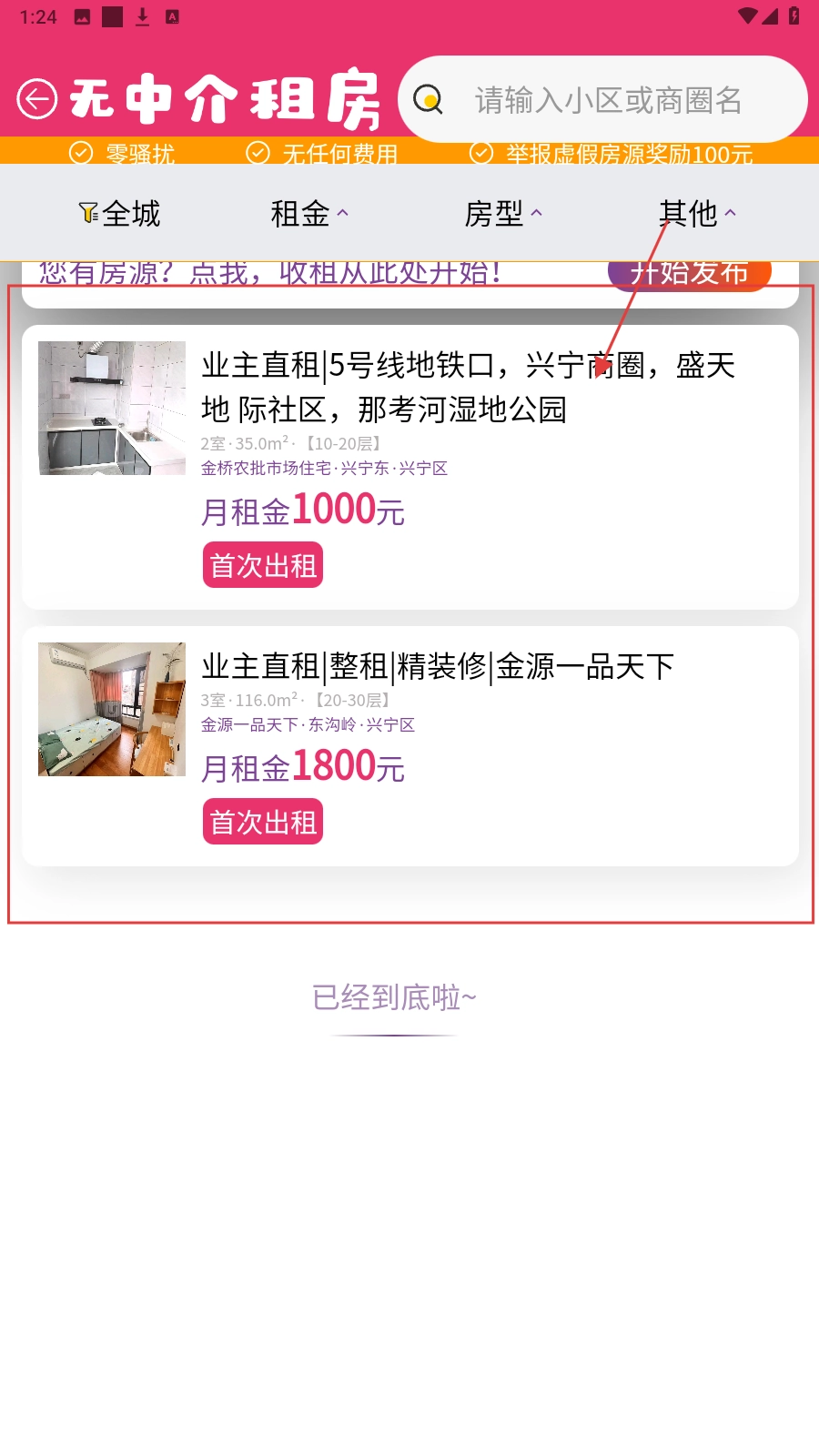 3、在无中介租房,用【租金】【房型】筛选项,定位匹配房源信息。