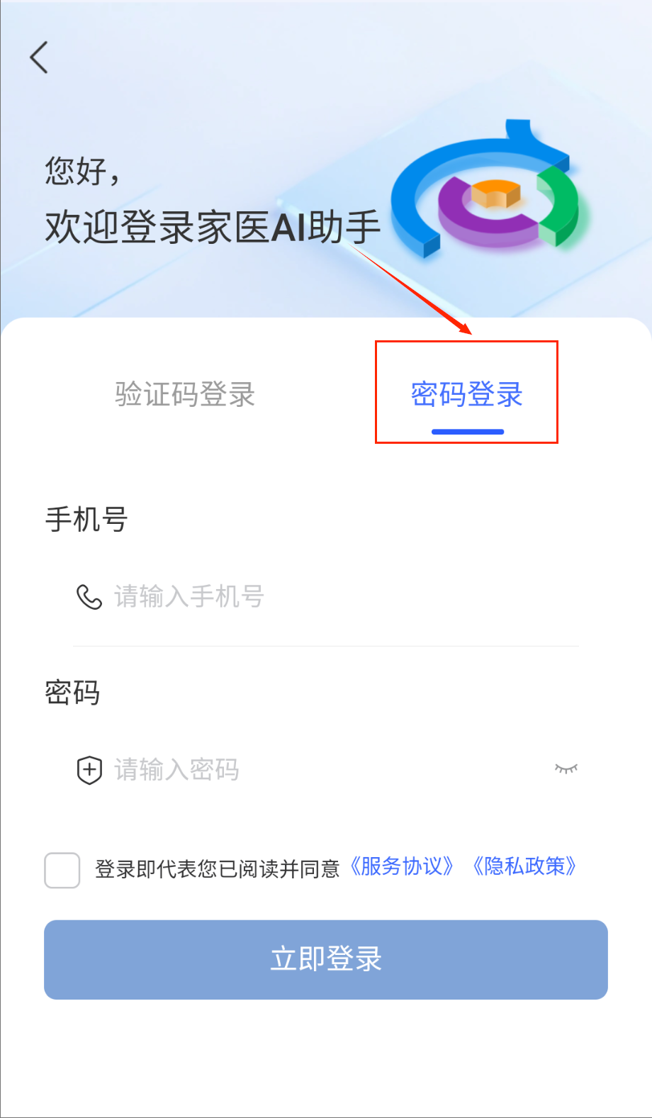 1、打开软件看到登录界面呢,先选择喜欢的登录方式。密码登录要输入手机号和设置好的密码,注意密码要区分大小写字母哦。