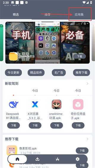 在应用商店类首页,点击右上角的【应用集】按钮,即可进入应用集板块。