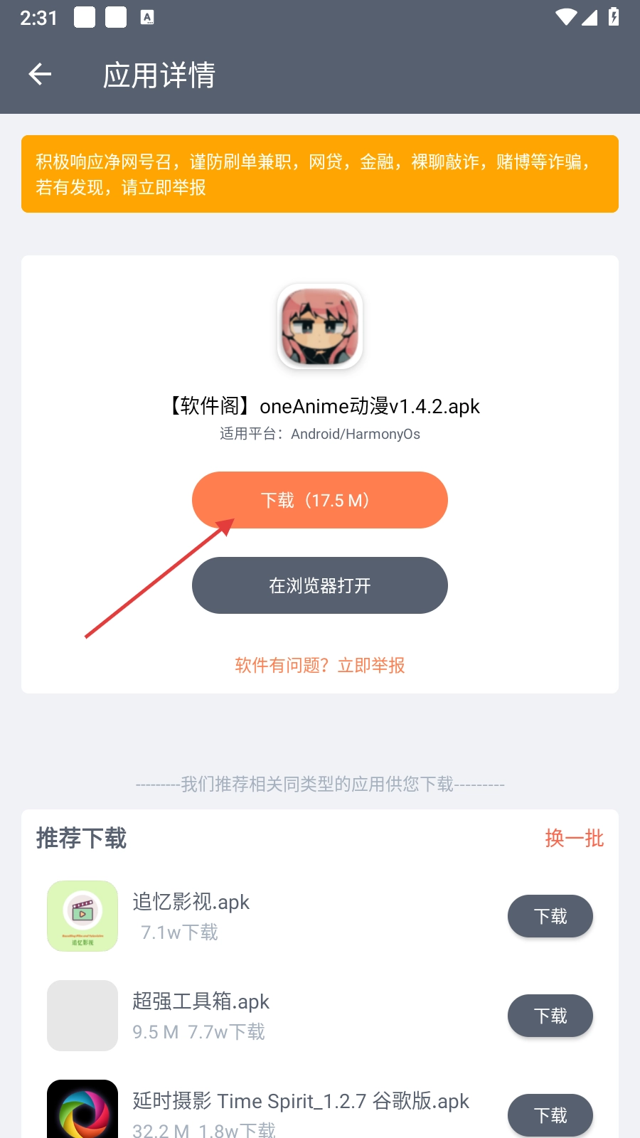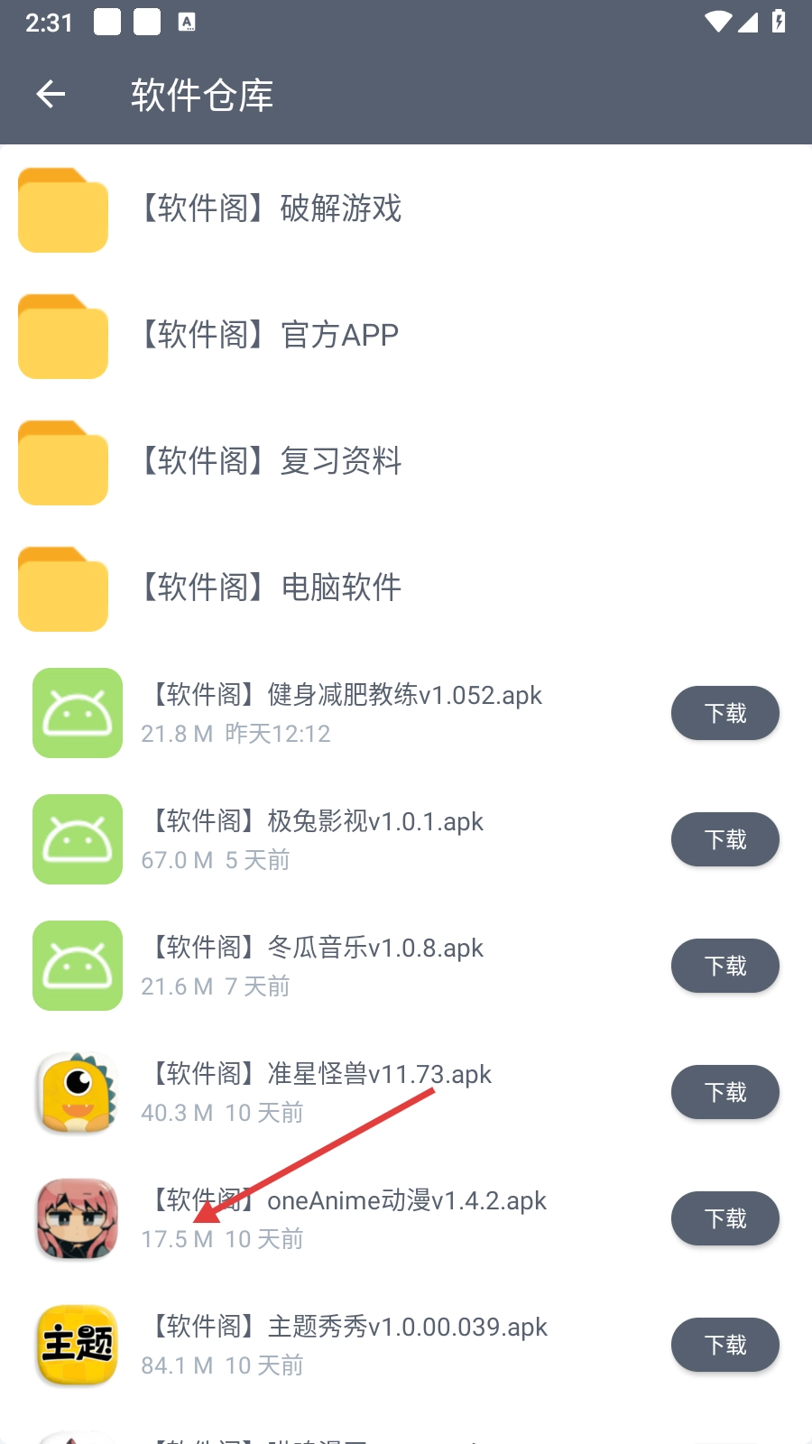 3、进入软件仓库页面后,挑选你想要的应用(例如“oneAnime动漫”),点击该应用进入其详情页面。