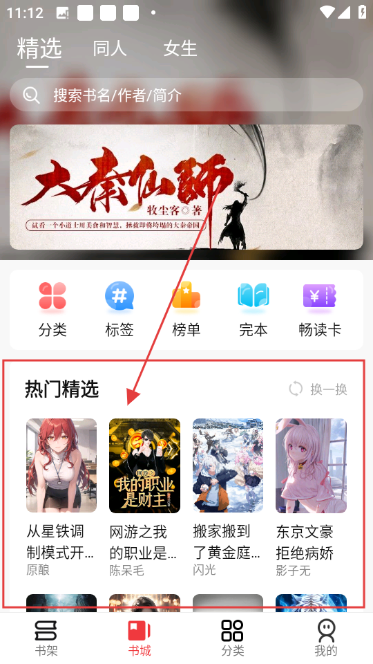1、在书城热门精选板块找到喜欢的书籍,比如《从星铁开始的创造者模式》,点击进入书籍详情页哦。