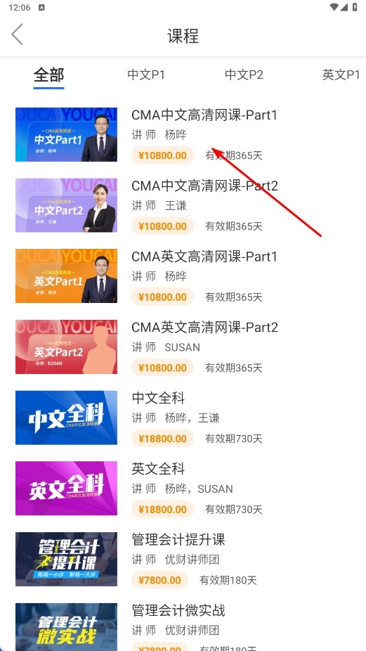 在课程列表页面,能够浏览中文P1、中文P2等各类CMA分类课程。