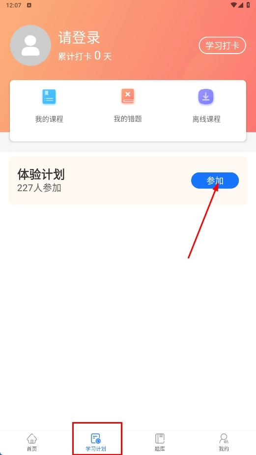 4、点击底部的【学习计划】功能按钮,进入学习计划页面后,点击【参加】功能按钮即可加入体验计划。