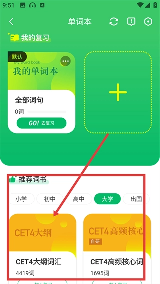 3、进入单词本页面后,选择【CET4大纲词汇】这类词书,就能查看对应的词汇列表,便于积累英语单词哦。