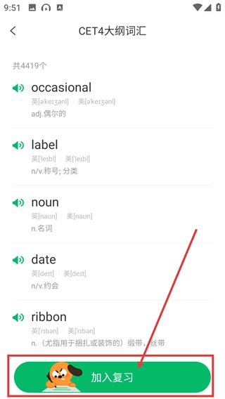4、在词汇详情页点击【加入复习】按钮,就能将当前词汇添加至复习列表,方便后续进行针对性的巩固学习。