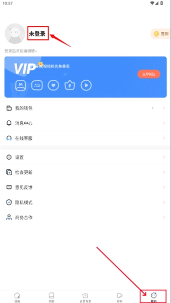 2、在我的页面中,点击图像旁边的【未登录】。