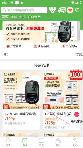 3、全场景商城服务:严选血糖仪、试纸、控糖食品等产品,提供价格优惠并支持蜜豆抵扣,让您足不出户即可满足护理需求。