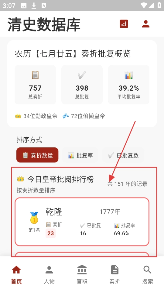 1、首页设有【奏折批复概览】与【皇帝批阅排行榜】板块,若想查看乾隆的批阅情况,点击相应区域即可。