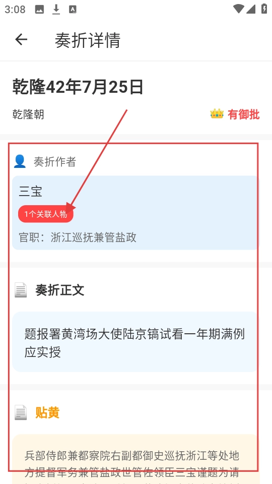 3、【奏折详情】页面包含作者、正文等信息,例如【三宝】的奏折,可查看其官职与奏折内容。
