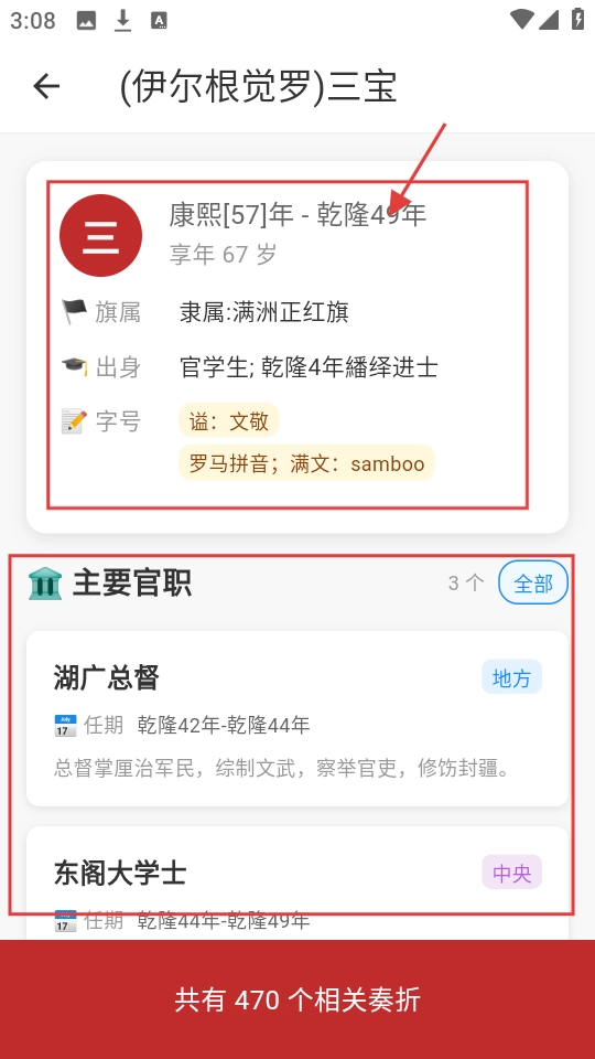 4、查看关联人物,可详细了解【三宝】的生平、旗属、出身等信息,以及其主要官职,内容十分详尽。