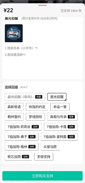 3、接着选择回报,选好以后点击“立即购买支持”