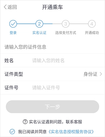 3、填写本人姓名与证件号码,勾选“我已阅读并同意《实名信息授权服务协议》”后,点击“下一步”按钮