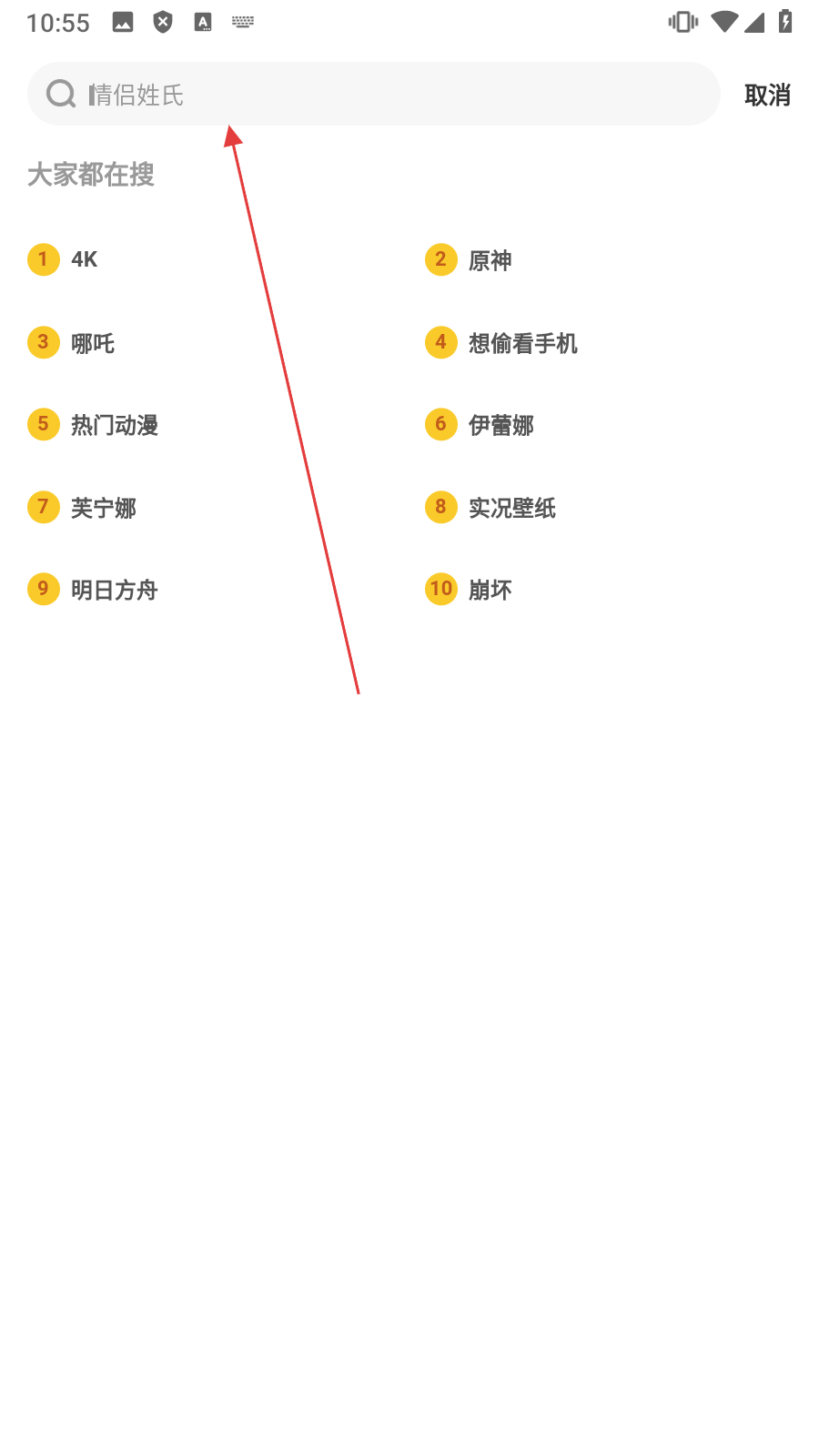 1、点击【顶部搜索框】,进入搜索输入页面。