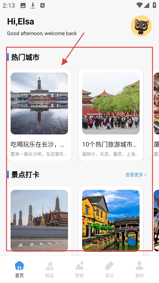 1、进入首页,有【热门城市】【景点打卡】板块,可选长沙等热门城市,查看当地游玩攻略。