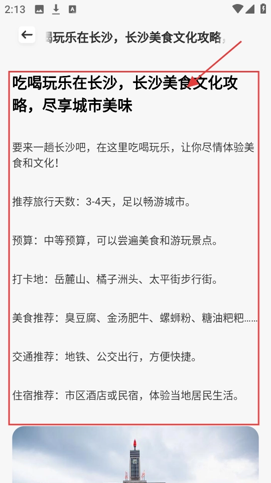 2、进入【长沙攻略页】,能看旅行天数、预算、打卡地、美食等推荐,按攻略规划长沙之行。