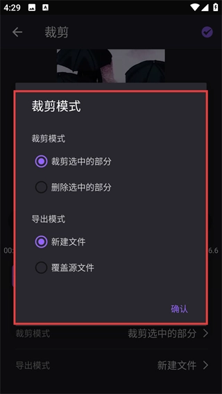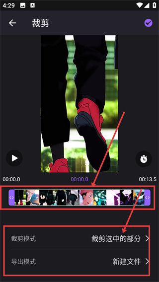 进入裁剪页面后,拖动时间轴来选定需要保留的片段,接着点击对应的选项,就可以设置裁剪模式了。