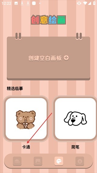 2、进入【创意绘画】界面后,点击【卡通】选项,就能进入卡通图案临摹列表。