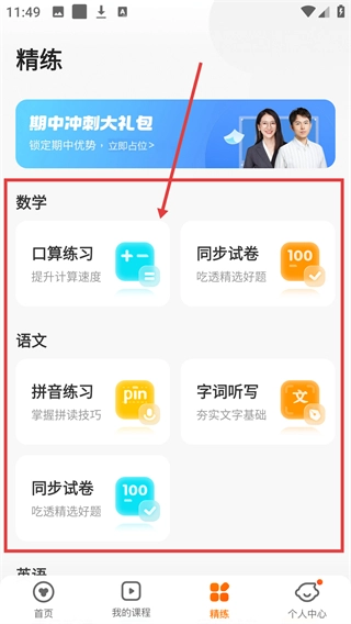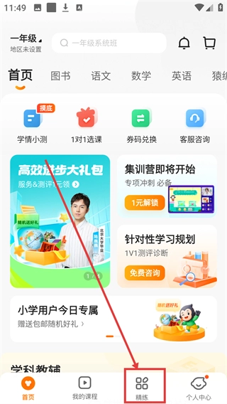 1、在首页点击底部【精练】,进入练习页面,能看到各学科的专项练习入口哦。