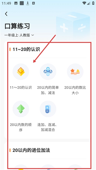 3、在口算练习界面选择【11~20的认识】知识点,即可进入该模块的练习准备页面哦。