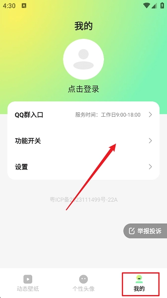 2、如图,手机下栏点击“我的”,选择功能开关。