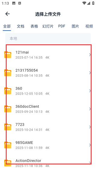 4、点击【本地上传】选项后,系统会跳转至文件选择界面,此时您可以从本地文件夹列表中找到并选择需要上传的文件。