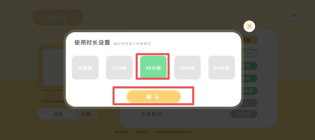 3、点击“使用时长”选项,挑选你希望设定的时间,然后在页面上找到“确定”按钮并点击。